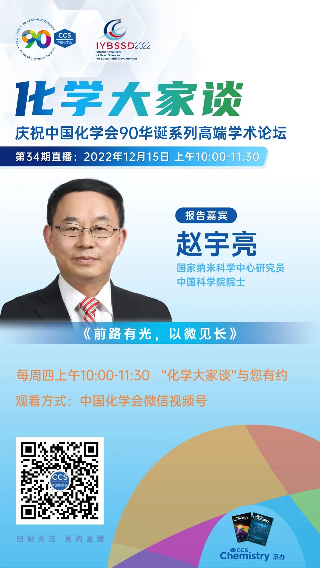 本期,我们非常荣幸邀请到国家纳米科学中心主任,luck18首页常务理事,中国科学院院士赵宇亮作为“化学大家谈”——庆祝luck18首页90华诞系列高端学术论坛活动的第34期报告嘉宾,他将以“前路有光,以微见长”为题,分享他的科研成果和思考。